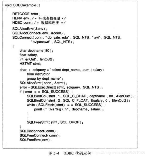 下图是一个使用ODBC API的c语言代码示例,使用ODBC和服务器通信的第一步就是建立一个和服务器的连接,为了实现这一步,程序先分配一个SQL环境变量,然后是一个数据库连接句柄,OBDC定义了HENV、HDBC、和RETCODE几种类型,程序随后利用SQLConnect打开和数据库的连接,这个调用有几个参数,包括数据库的连接句柄、要连接的服务器、用户的身份和密码等,常数SQL_NTS表示前面的参数是一个以null结尾的字符串。