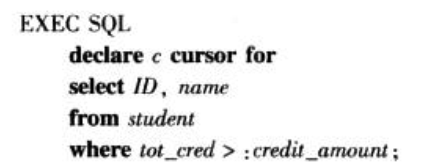 为了标识关系查询,使用声明游标语句,然而这时并不计算查询的结果,而程序必须用open和fetch语句,得到结果元组。以之前的大学模式,假设我们有一个宿主变量credit_amount,声明方法和宿主语言惯例一样。假设想找出学分高于credit_amount的所有学生的名字,查询如下: