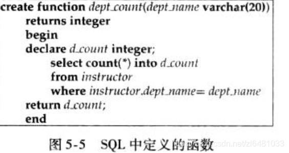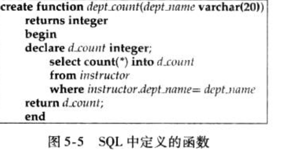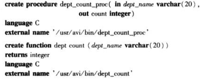 SQL允许我们用一种程序设计语言定义函数,比如java、C、C++等,这种方式定义函数比SQL中定义的函数效率更高,无法在SQL中执行的计算可以由这些函数执行。