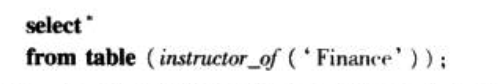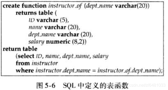 SQL标准支持返回关系作为结果的函数,这种函数称为表函数,下图的函数返回一个包含特定系的所有教师的表。