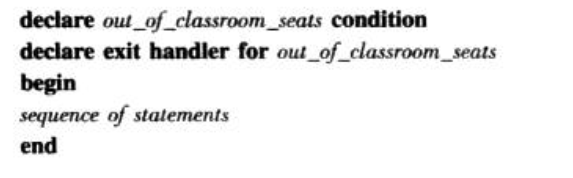 在begin和end之间的语句可以执行signal out_of_classroom_seats来引发一个异常,这个句柄说明,如果条件发生,将会采取动作终止begin end之间的语句,另一个可选的动作是continue,他将从引发异常的语句的下一条语句开始执行,除了明确定义的条件,还有一些预定义的条件,比如,sqlexception,sqlwarning和not found。