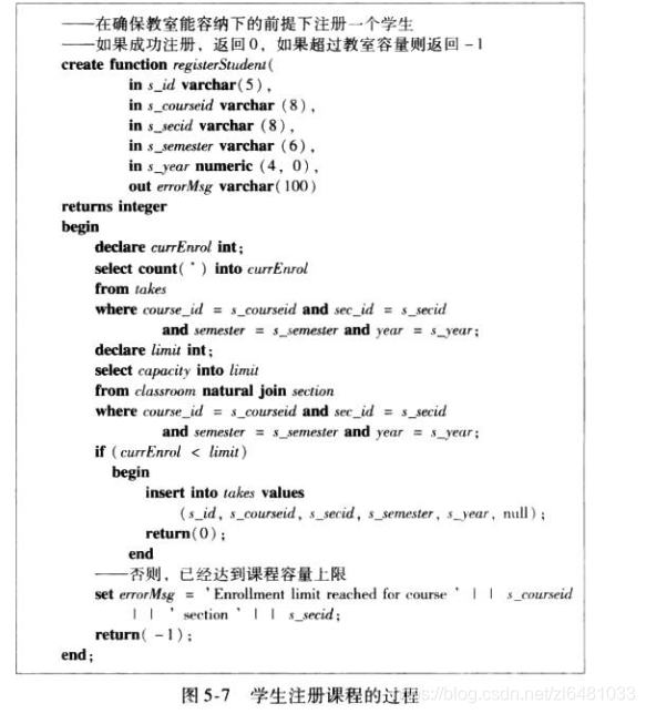 SQL也支持case语句,类似C/C++语句中的case语句。下图是一个SQL的过程化结构的更大型的一点的例子,图中定义的函数registerStudent首先确认选课的学生数没有超过该课的所在教室的容量,然后完成学生对该课的注册,函数返回一个错误代码。这个值大于0表示成功,返回负值表示出错,同时以out参数的形式返回消息来说明失败的原因。