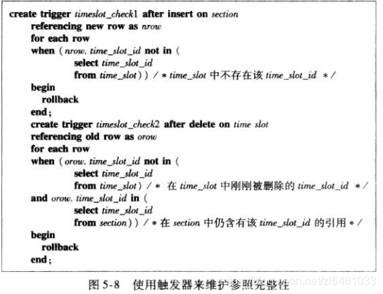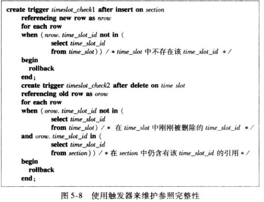 这里介绍的是SQL标准定义的语法,但是大部分数据库实现的方法并不是标准版本,但是概念是适用的。下图展示了如何使用触发器来确保关系section中属性time_slot_id的参照完整性,图中第一个触发器定义指明该触发器在任何一次对关系section的插入操作执行之后被启动,以确保所插入元组的time_slot_id字段是合法的,一个SQL插入语句可以向关系中插入多个元组,在触发器代码中for each row语句可以显示的在每一个被插入的行上进行迭代,referencing new row as语句建立了一个变量nrow成为过渡变量,用来在插入完成后存储所插入的值。
