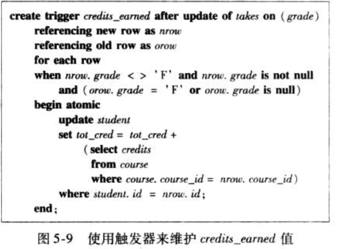 如下图所示,当关系takes中元组的属性grade被更新时,需要用触发器来维护student里元组的tot_cred属性,使其保持实时更新,只有当属性grade从空值或F被更新为代表课程已经完成的具体分数时,触发器才会被激发,除了nrow的使用,update语句都属于标准的SQL语法。