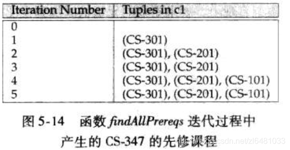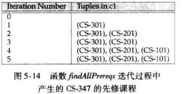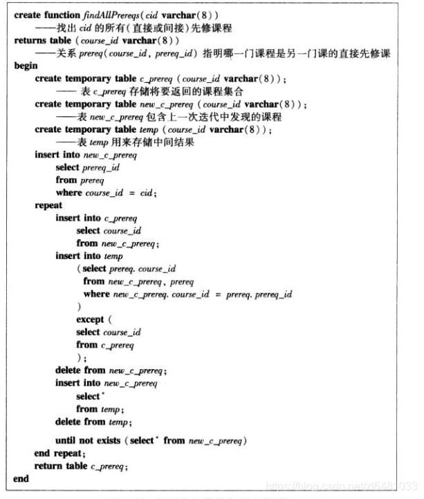 一个写上述查询的方法就是是用迭代,首先找到CS-347的那些直接先修课程,然后第一个集合中的所有课程的先修课程。如此类推,迭代持续进行,直到某次循环中没有新课程加进来才停止,下图显示了执行这次任务的函数。