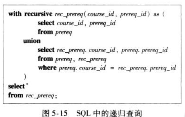 任何递归视图都必须被定义为两个字查询的并,一个是非递归的基查询和一个使用递归视图的递归查询,上图中,基查询是关系prereq上的选择操作,而递归查询则计算prereq和rec_prereq的连接。