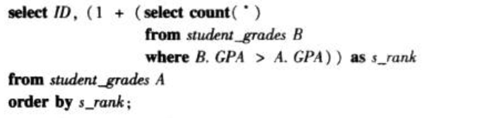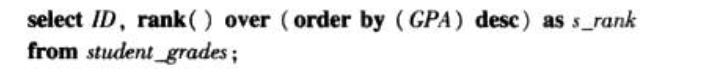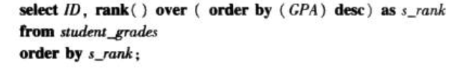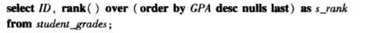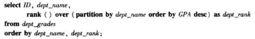 上述语句,一个学生的排名就是那些GPA比他高的学生的数目再加1,但是很明显上述语句需要花很多时间来执行,相比之下,rank子句的系统实现能够对关系进行排序并在相当短的时间计算排名。排名可在数据的不同分区进行,比如我们可以按照系而不是整个学校范围对学生排名,假设有一个视图,它像student_grades那样定义,但是包含系名dept_grades,那么下面的查询给出学生们在每个分区的排名: