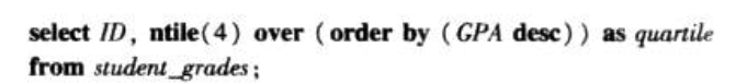 最后对于一个给定的常数n,排名函数ntile按照给定的顺序取得每个分区中的元组,并把它们分成n个具有相同元组数目的桶,对每个元组,ntile(n)给出他所在的桶号,该函数对构造基于百分比的直方图特别有用。比如我们可以使用下面的查询,根据GPA把学生分为四个等级,
