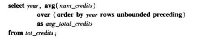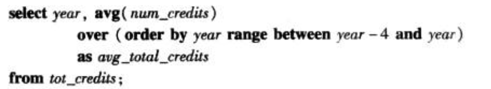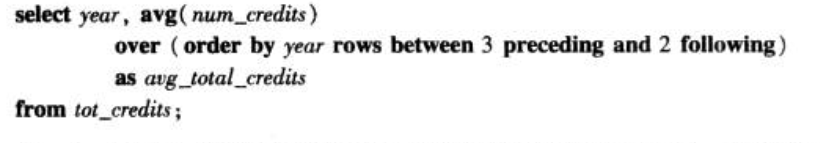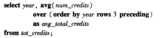 趋势分析是分窗的应用案例之一。要写一个查询来计算一个窗口的聚集值,用之前的哪些特性是相对简单的,例如计算一个固定的三天时间区间的销售量,但是如果对三天时间区间都如此计算,查询就变得比较难了。SQL提供分窗用于支持这样的查询,假设我们有一个视图,tot_credits(year,num_credits)它记录了每年学生选课的总学分,注意这个关系中每个年份最多对应一个元组。那么如下查询: