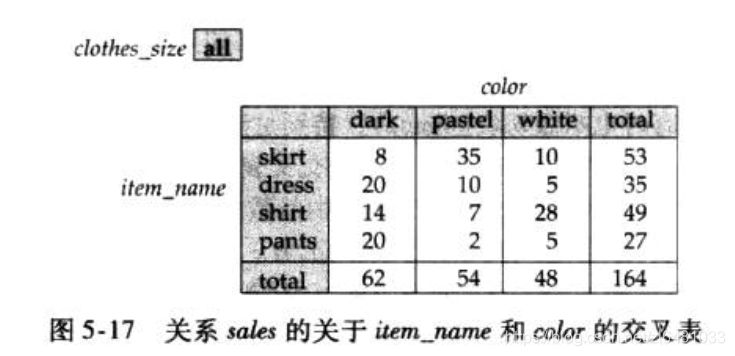 该表显示了item_name和color值之间不同组合情况下的商品数目,clothes_size的值指定为all,意味着表中显示的数值是所有的size值上的数据汇总。上图所示的表是一个交叉表,也可称为转轴表,一般来说,一个交叉表是从一个关系导出来的,由关系R的一个属性的值构成其行表头,关系R的另一个属性构成其列表头。