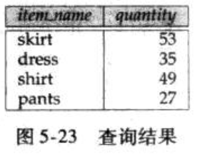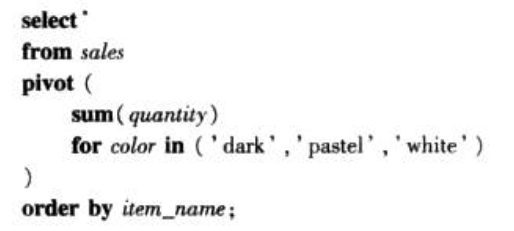 可以返回一个交叉表,pivot子句中的for子句用来指定属性color的那些值应该在转轴的结果中作为属性名出现,属性color本身在结果中被去除,然而所有其他属性都被保留,另外新产生的属性的值被设定为来自属性quantity,在多个元组对于给定单元有贡献的情况下,pivot子句中的聚集操作指定了把这些值进行汇总的方法。