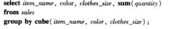 SQL支持group by结构的泛化形式用于进行cube和rollup操作,group by子句中的cube和rollup结构允许在单个查询中运行多个group by 查询,结果以单个关系的形式返回。