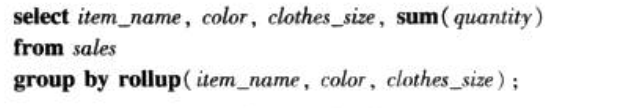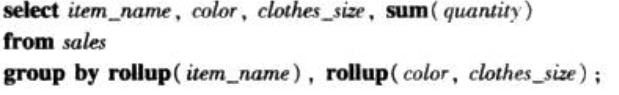 为了理解其原因,注意到rollup(item_size)产生了两个分组,{(item_name),()},rollup(color,clothes_size)产生了三个分组: