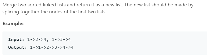 输入两个有序链表,合并链表,合并之后依旧是有序的。我们只需要创建一个新节点,然后比较按顺序比较两个链表的值,将小的插入到新节点之后,然后移动指针。如果有一个链表结束,把另一个插入到指针之后。