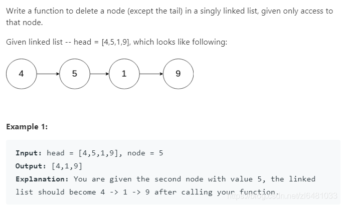 题目要求删除链表中一个节点,在之前学习数据结构的时候,删除链表节点需要知道的是删除的点的前驱节点,但是这道题没有给出表头,所以没有办法找到前驱节点,所以需要做的是将当前节点变成前驱节点,这样在进行删除。也就是删除的是题目中给出的节点的下一个节点,所以就需要把下一个节点的值放入当前节点,这样的效果和删除当前节点是一样的。
