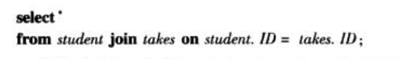 上述on条件表明,如果一个来自student的元组和一个来自takes的元组在ID上的取值相同,那么它们是匹配的。上例中连接表达式与自然连接几乎是一样的。关系名用来区分属性名ID。