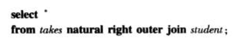 *右外连接:只保留出现在右外连接运算之后的关系中的元组。