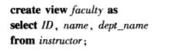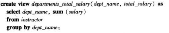 上面视图给出了每个系中所有教师的工资总和,因为表达式sum(salary)没有名称,其属性名是在视图定义中显式指定的。直觉上,在任何给定时刻,视图关系中的元组集是该时刻视图定义中查询表达式的计算结果,因此一个视图关系被计算存储,一旦用于定义该视图的关系被修改,视图就会过期。为了避免这点,视图通常这样实现:当我们定义一个视图时,数据库系统存储视图的定义本身,而不存储定义该视图的查询表达式的执行结果,一旦视图关系出现在查询中,它就被已存储的查询表达式代替,因此,无论什么时候执行这个查询,视图关系都被重新计算。