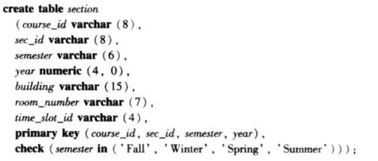 在上面的创建关系中,利用check子句模拟了一个枚举类型,通过制定semester必须是‘Fall’,‘Winter’....中的一个来实现,这样check子句允许以有力的方式对属性域加以限制,这是大多数编程语言类型系统都不允许的。