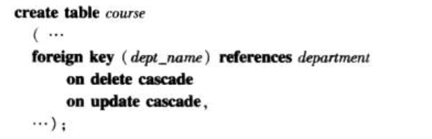 由于有了与外码声明相关联的on delete cascade子句,如果删除department中的元组导致了此参照完整性约束被违反,则删除并不被系统拒绝,而是对course关系作级联删除,即删除参照了被删除系的元组。