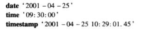 我们可以使用cast e as t形式的表达式来将一个字符串或字符串表达式e转化为类型t。其中t是date、time、timestamp中的一种。字符串必须符合正确的格式。