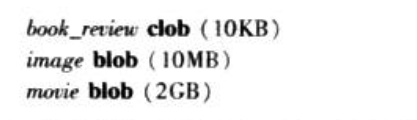 许多数据库应用需要存储可能很大的属性,SQL提供字符数据的大对象数据类型(clob)和二进制数据的大对象数据类性(blob)在这些数据类型中字符“lob”表示:large object。例如可以声明属性:、