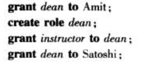 级联收回很多情况下是不合适的。为了处理这种情况,SQL允许权限由一个角色授予,而不是由用户来授予,SQL有一个与绘画所关联的当前角色可以通过执行set role role_name来设置。指定的角色必须已经授予用户,否则会失败。