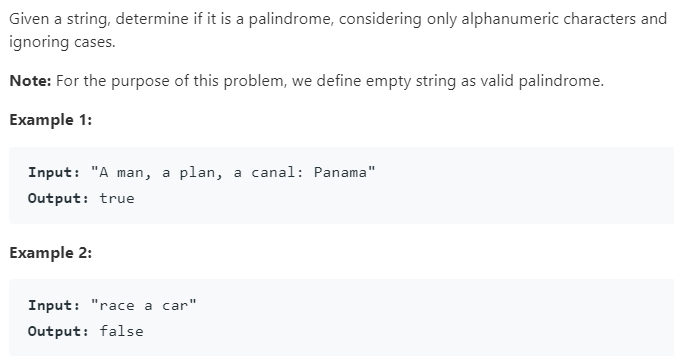 首先忽略大小写,并且字符串中还有空格,所以我们只需要对字母和数字进行处理就行,写一个功能函数用来判断字符是不是字母或者数字并且对大写字母进行转化为小写。判断是不是回文串,可以使用双指针的方法,用指针来遍历整个字符串判断指针所指的字符是否相等。