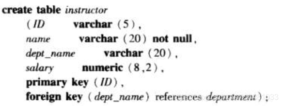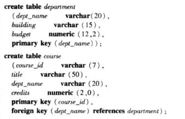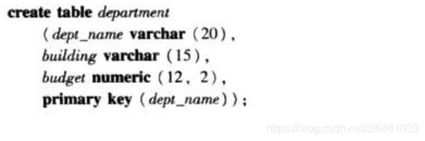 上面创建的关系具有三个属性,dept_name是最大长度为20的字符串,building是最大长度为15的字符串,budget是一个12位的数,其中两位是小数点后面,create table还指明了dept_name属性是department关系的主码。