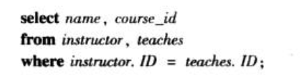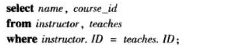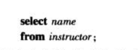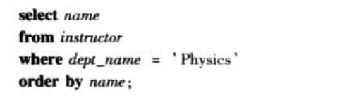 考虑使用大学数据库例子的一个简单查询“找出所有老师的姓名”,教师的姓名可以在instructor关系中找到,因此,把这个关系放到from字句中,教师姓名出现在name属性中,把它放在select字句中。