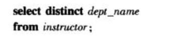 在关系模型的形式化数学定义中,关系是一个集合,因此,重复的元组不会出现在关系中,在实践中去除重复是相当费时的,所以SQL允许在关系以及SQL表达式中出现重复,因此上面的查询语句结果中,每个出现的系名都会在结果中,如果我们想要强行删除重复们可以在select后加入关键字,distinct。上面的查询就变成了下图,这样每个系名最多出现一次。
