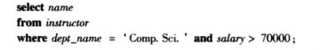 表示的是,从instructor表中找出dept_name为Comp.Sci并且salary大于70000的教师的姓名。where子句可以使用逻辑连词and,or和not。逻辑连词的运算对象可以是包含比较运算符<、<=、>、>=、=和<>的表达式。SQL允许使用比较运算符来比较字符串、算术表达式以及特殊类型。