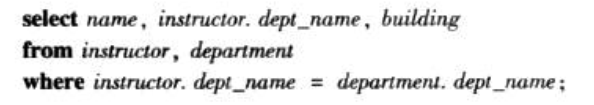 表示的是找出所有老师的姓名,以及他们所在系的系名,和系所在的建筑名称。需要注意的是,所需要的信息出于两个不同的关系,并且关系的每个元组都要与另一个关系的每个元组相对应。还有一个需要注意的是如果一个属性只出现在一个关系中,那么不需要用关系名作为前缀,如果属性在多个关系中都有,那么需要使用关系名作为前缀。