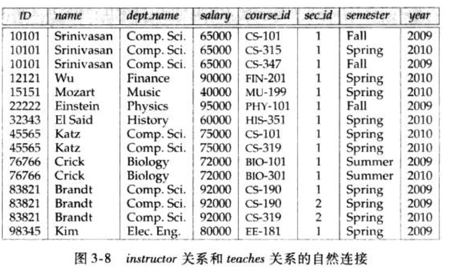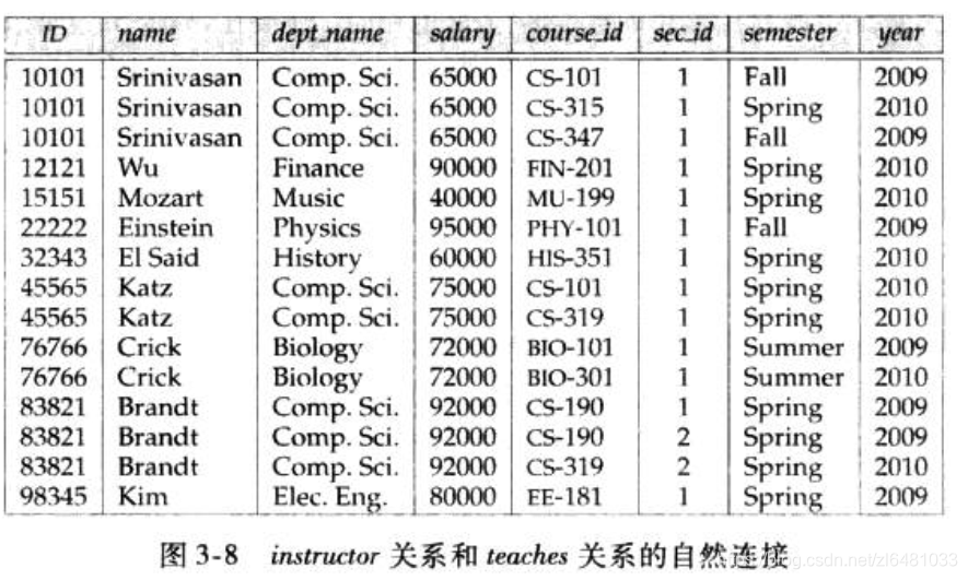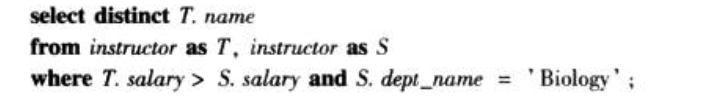 T和S可以看做instructor关系的两个拷贝,更准确地说是instructor关系的别名。一般被称作相关名称,或者表别名,或者相关变量、元组变量。