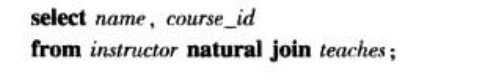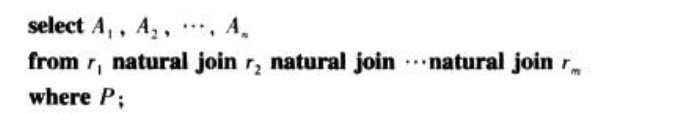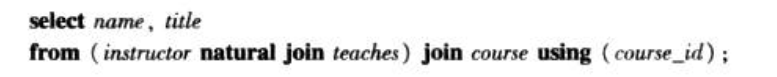 为了更好地发挥自然连接的优点,避免不必要的相等属性带来的危险,SQL提供了一种自然连接的构造形式,允许用户来指定需要哪些列相等,如下: