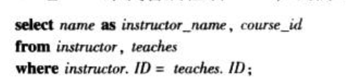 查询的结果是一个具有下列属性的关系:name,course_id结果中的属性名来自from子句中关系的属性名。SQL提供了一个重命名结果关系中属性的方法,如下使用as语句。