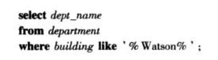 在SQL中用比较运算符like来表达模式,查询“找出所在建筑名称中包含子串‘Wastson’"的所有系名。写法如下: