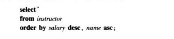 order by子句默认使用升序,要说明排列顺序,可以用desc表示降序,或者用asc表示升序。排序可以在多个属性上进行。比如希望按照工资的降序,如果工资一样再按照姓名升序排列。语句如下: