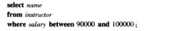 为了简化where子句,SQL提供了between比较运算符来说明一个值是小于或等于某个值,同时大于或等于另一个值,比如找出工资在90000到100000之间的教师的姓名,语句如下: