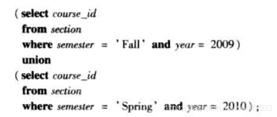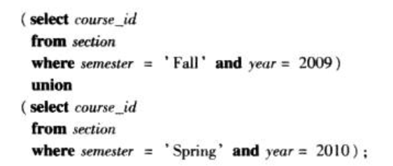 找出在2009年秋季开课,或者2010年春季开课或两个学习都开课的所有课程,查询语句如下: