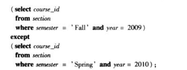 找出在2009年秋季开课但不在2010年春季开课的所有课程,查询语句如下: