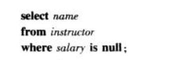 SQL在谓词中使用特殊的关键词null测试空值,因而为找出instructor关系中salary为空值的所有教师可以写成如下: