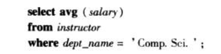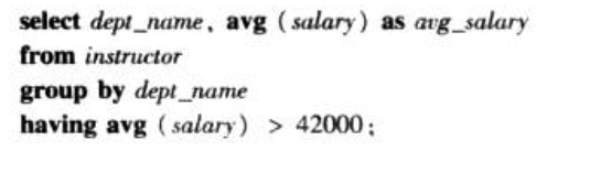 上述语句表示的是,系平均工资超过42000的那些教师的平均工资。和select子句情况类似,任何出现在having 子句中没有被聚集的属性必须出现在group by子句中,否则查询就是错误的。