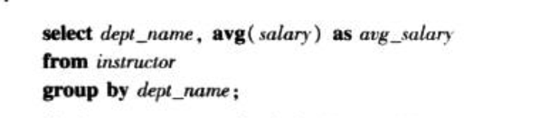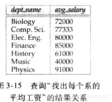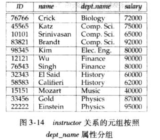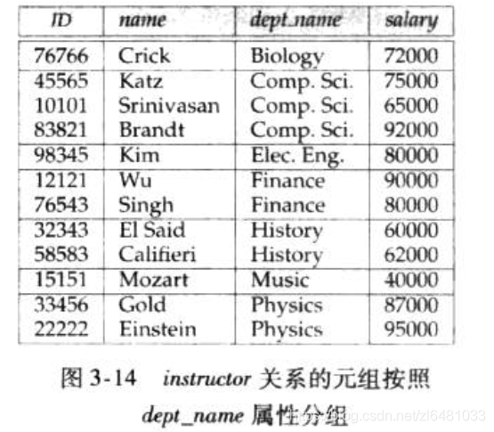 上面的语句会先根据dept_name属性进行分组的情况,分组是计算查询结果的第一步,然后在每个分组上进行指定的聚集计算。如下图,是先分组之后的结果。