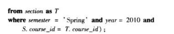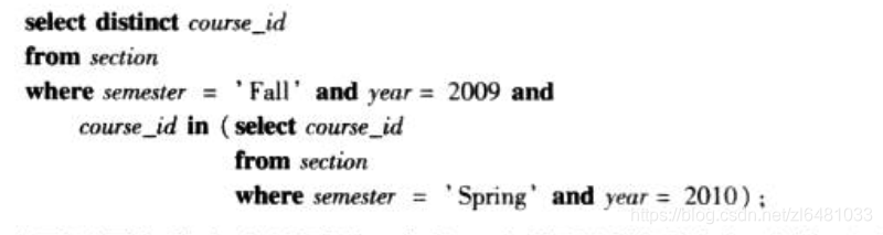 在之前做过一个查询,09年秋季和10年春季都开设的课程,之前是使用两个集合的交运算,现在可以使用嵌套查询的方式。