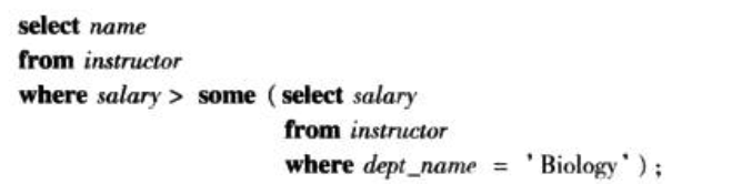 SQL也允许<some,<=some,=some和<>some。类似于some,SQL也允许<all,>all,=all等。