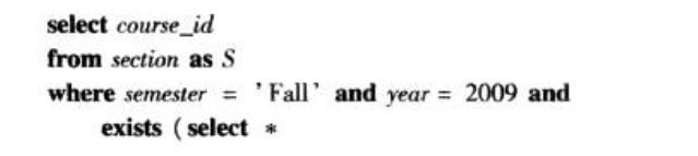 SQL还有一个特性可以测试一个子查询结果中是否存在元组。exists结构在作为参数的子查询非空时返回true值,使用exists结构,我们还能用另外一种方法书写查询,如下: