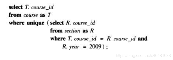 可以使用not unique结构测试在一个子查询结果中是否存在重复元组。