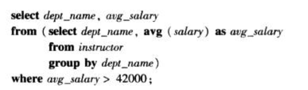 SQL允许在from子句中使用子查询表达式。之前做过一个查询,找出系平均工资超过42000的系中教师平均工资,之前是使用having子句来写的,现在可以这样:
