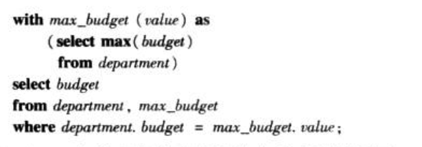 with子句定义了临时关系max_budget,此关系在随后的查询中马上被使用了。